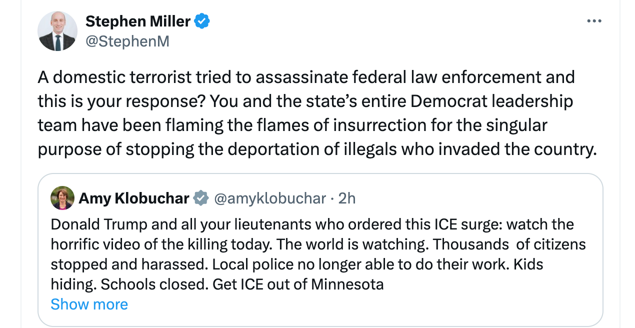 But the Trump regime is peddling another story. They are saying Alex was a “domestic terrorist” who “tried to assassinate federal law enforcement” per Stephen Miller’s post.
