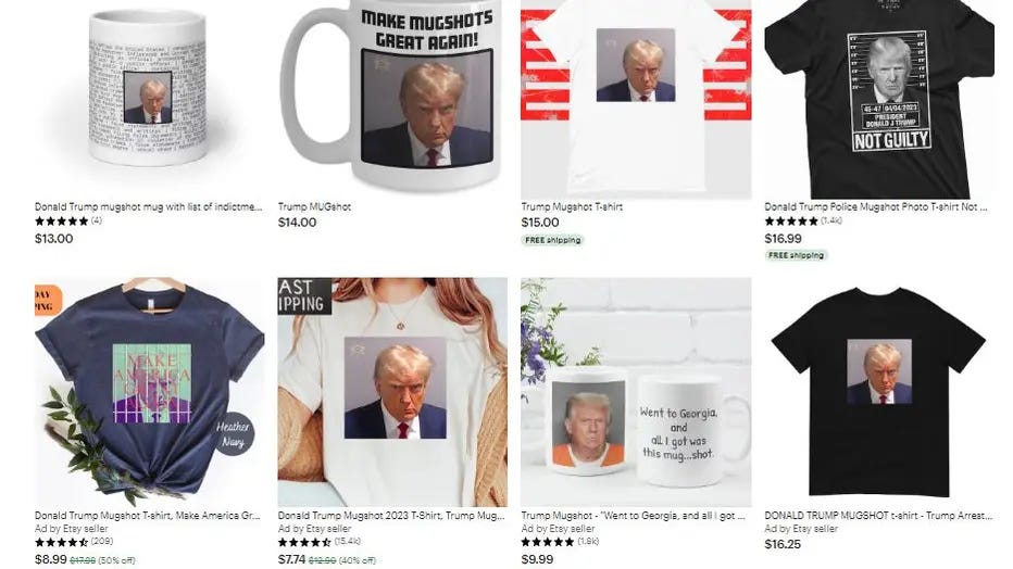 Donald Trump's Save America fundraising committee is selling "NEVER SURRENDER!" Trump mugshot t-shirts ($34.00), beverage holders ($15.00 for two) and coffee mugs ($25.00). Then there is the Trump campaign’s sale of a signed poster ($28), a beer cozy ($15), and bumper stickers ($12)—all bearing his mugshot. You name it, and Trump is selling it with his mugshot taken by the Fulton County Sheriff. While we don’t know exactly how much he has raised from these sales, Politico reports Trump raised nearly $7 million in the days after he was booked in the Fulton County prison.